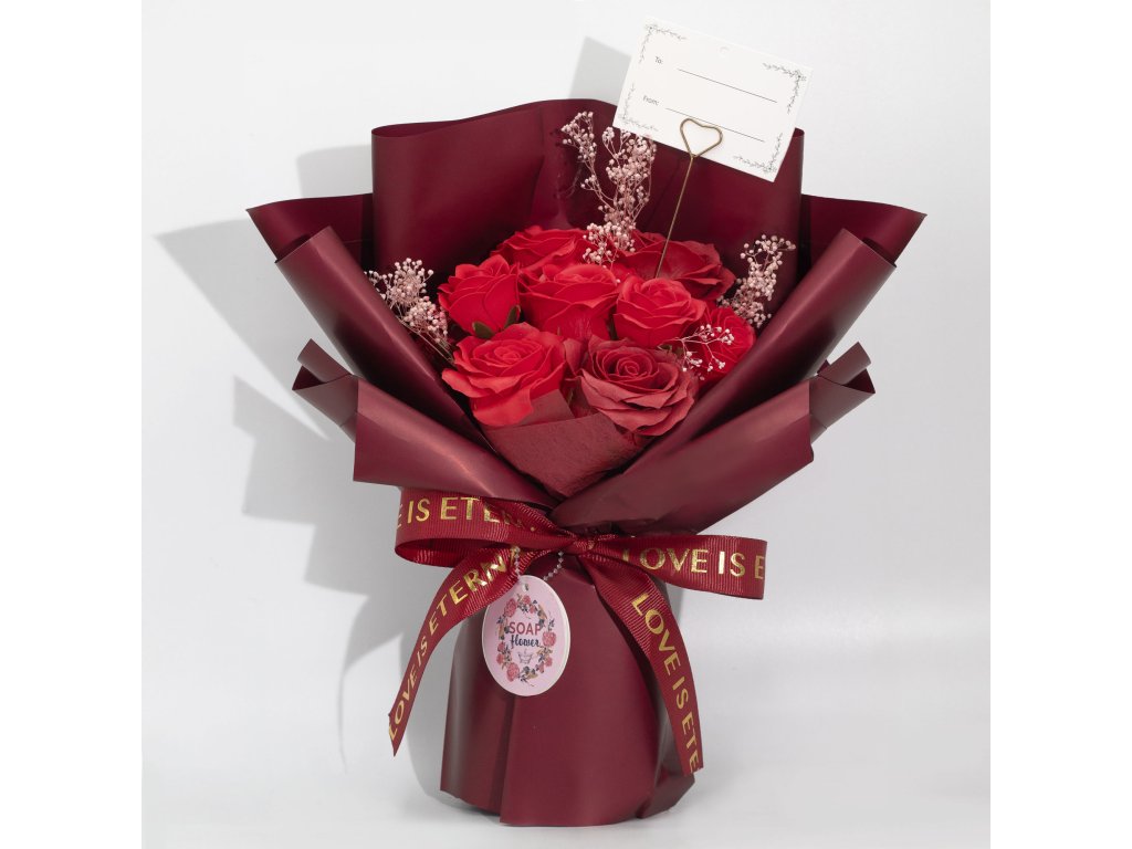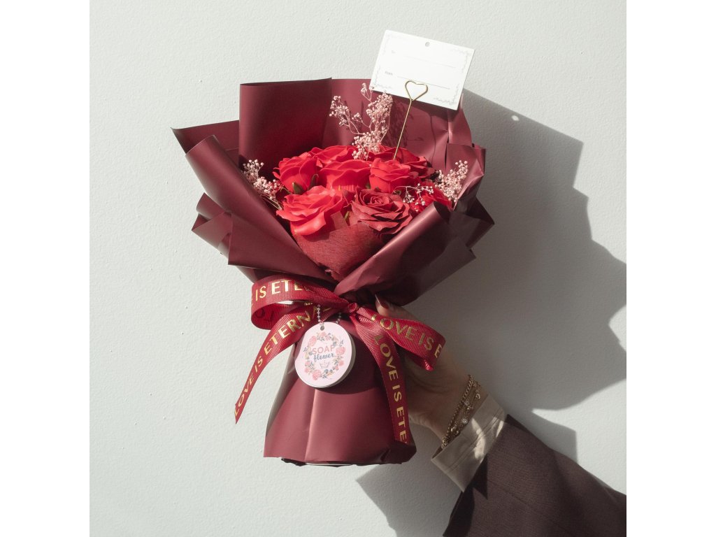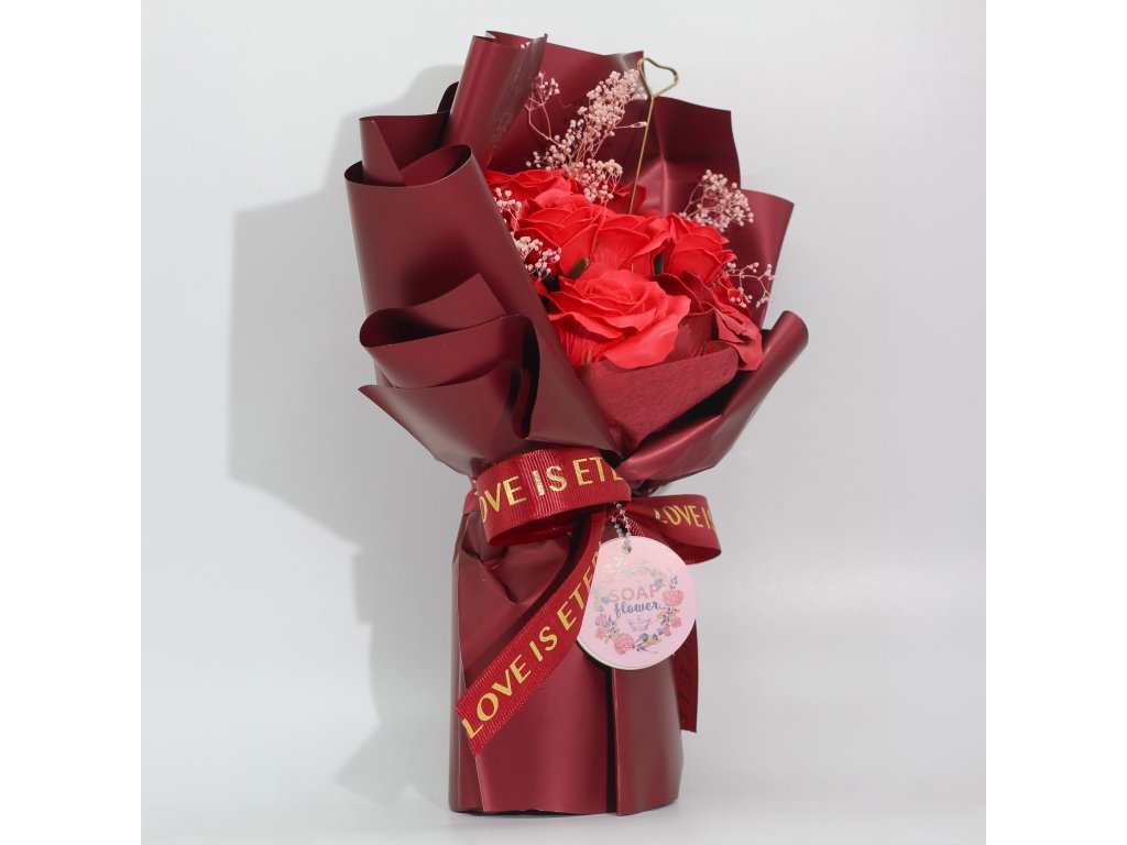 Ohromující kytice mýdlových květin navržená k vyjádření nadčasové lásky a elegance. Tato působivá kytice, vyrobená z jemných mýdlových okvětních lístků, vypadá přesně jako skutečné růže, ale vydrží mnohem déle.
